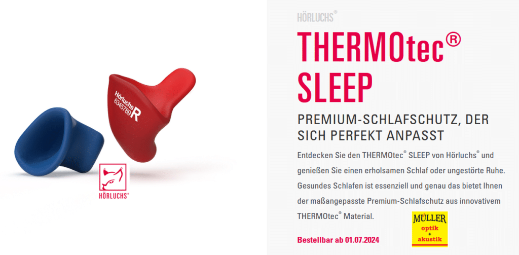 Hörluchs® erweitert sein Schlafschutz-Sortiment mit dem neuen THERMOtec® SLEEP. Dieses innovative Produkt besteht aus biokompatiblem THERMOtec®, das durch Körperwärme weich wird und sich perfekt an das Ohr anpasst. Mit der optionalen Entnahmelasche lässt sich der Schlafschutz leicht einsetzen und entfernen.